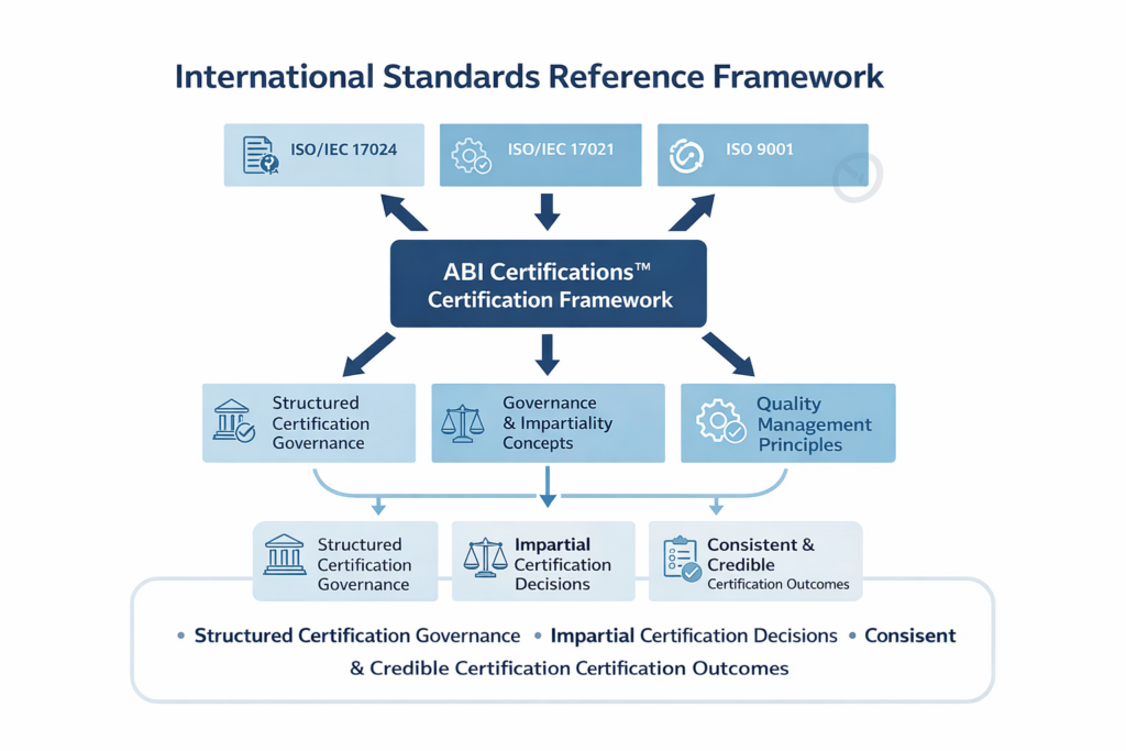 ABI Certifications™ develops and governs its certification frameworks with reference to internationally recognized standards and quality principles, including:
