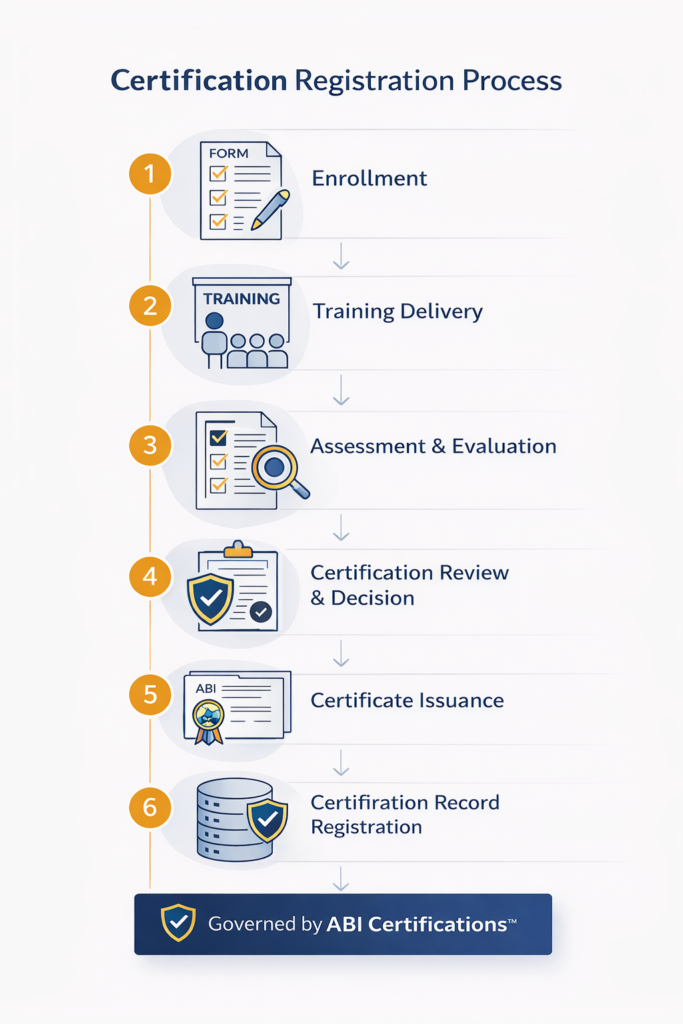 Certification decisions, certificate issuance, and certification record management are performed exclusively by ABI Certifications™. Training delivery and assessment activities do not influence certification decisions.